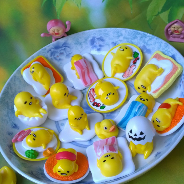 卵黄君gudetama怠惰な卵の卵黄兄はおもちゃの人形に入って手を振って食事をします。
