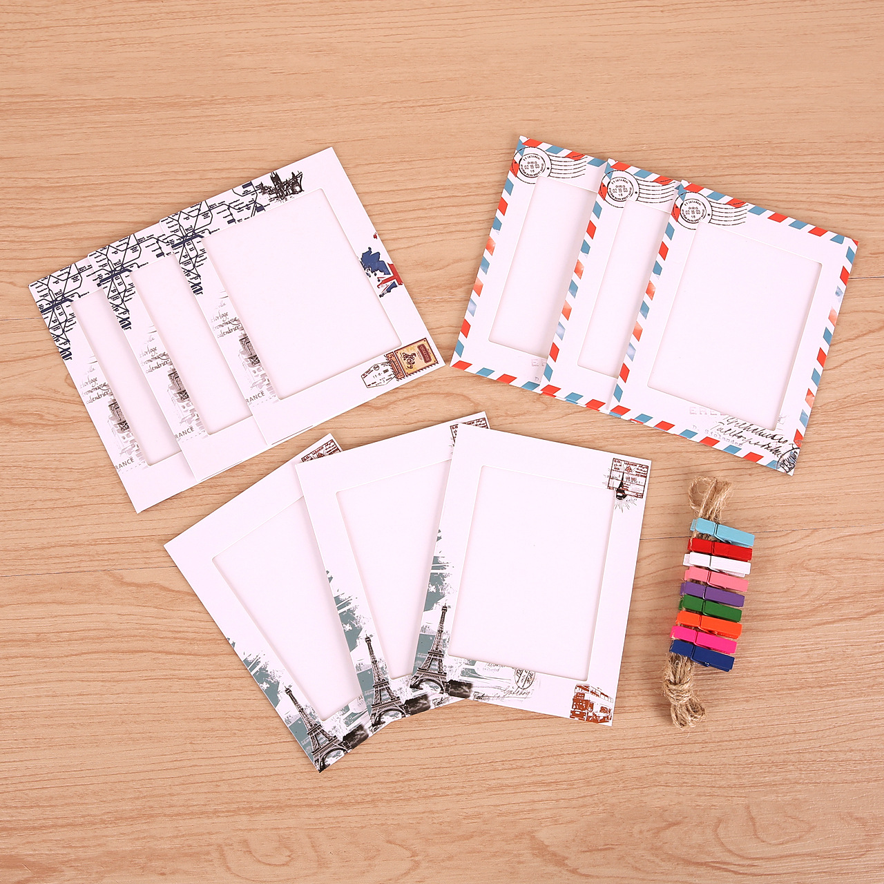 6インチヨーロッパ式紙カードフォトフレーム創意組み合わせ八彩建築風吊り式クリップ麻縄写真壁