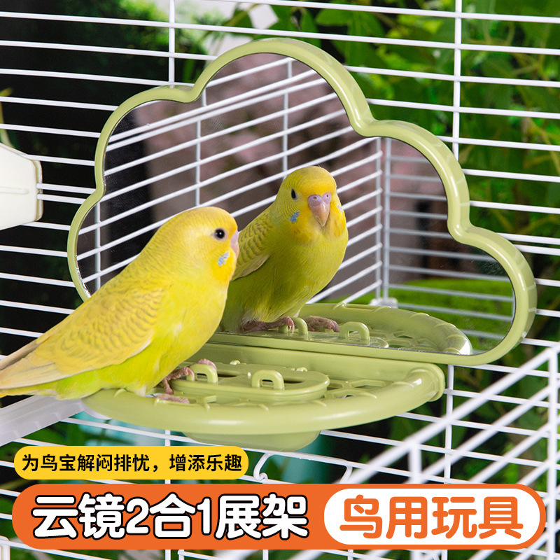 オウムの鳥の鏡の鳥のおもちゃの駅の棚は退屈します。