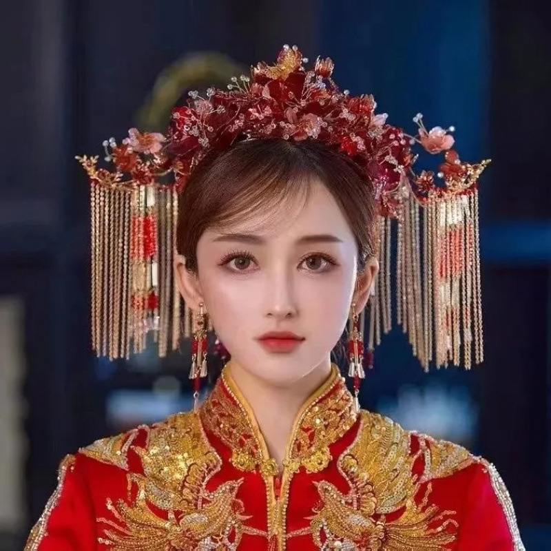 正統2024新作秀禾服新婦頭飾り中国式大気金色鳳冠結婚秀禾髪飾り丸顔飾り