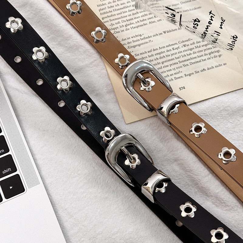 2025新型女性の小さいベルトの個性の復古梅の穴の装飾はジーパンの短いスカートの細いベルトの女性の金を配合します。