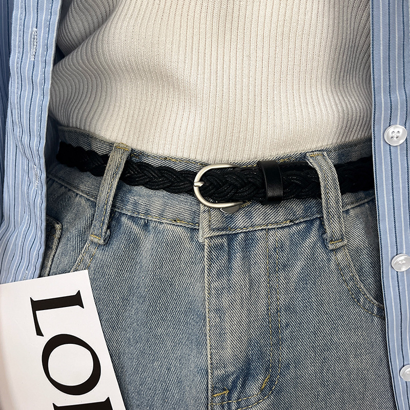 ベルトを編む女性の針はレトロでカジュアルです。