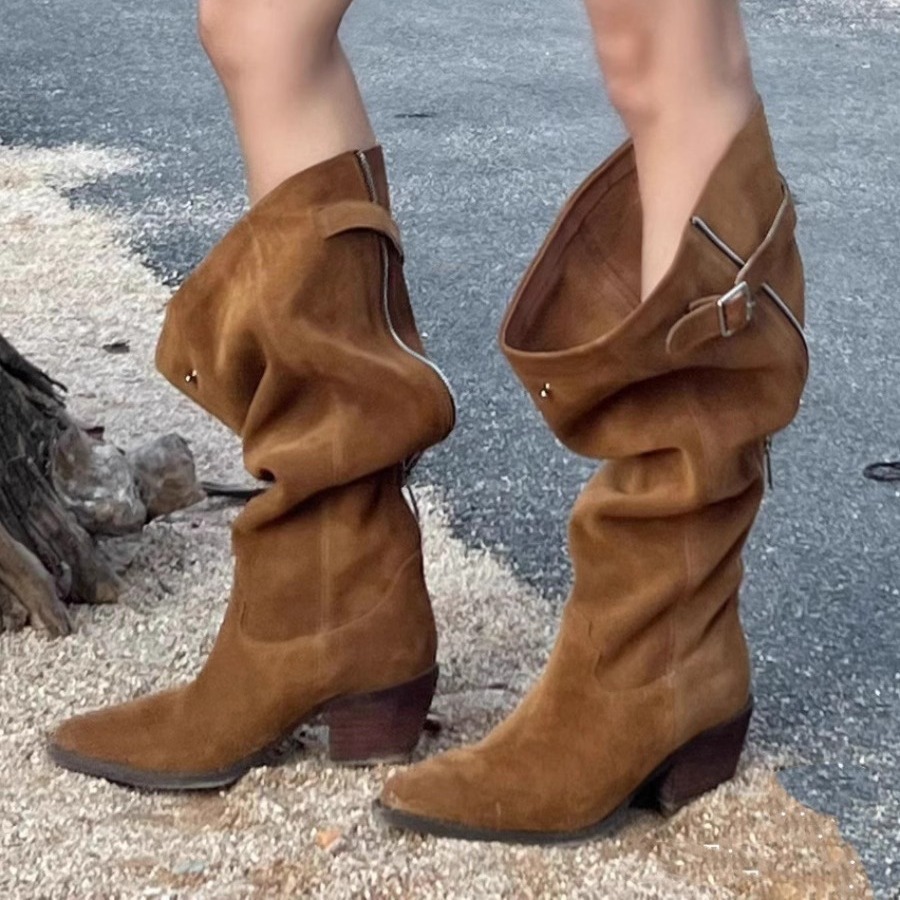 2025 新しいウエスタンスタイルカウボーイブーツ女性のためのプリーツパイルミッドカーフブーツレトロカラー厚いヒールズボン騎士ブーツ女性のための