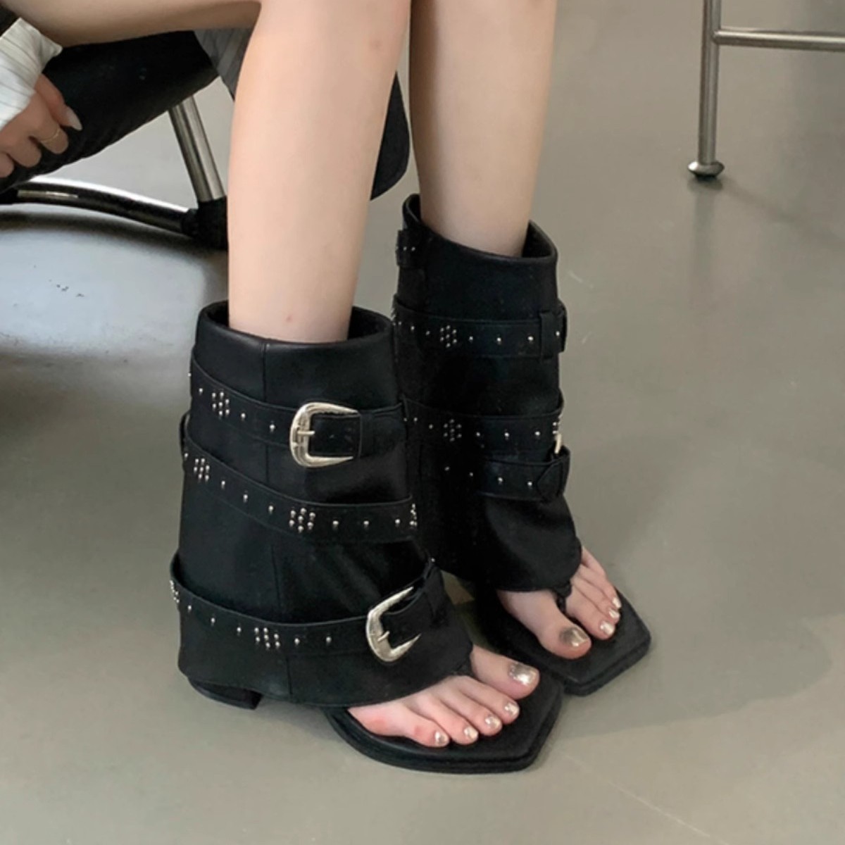 パンク風黒いリベットのつま先の人の字のサンダルの女性の靴の2025夏の新型の復古のバックルのギャルのズボンの靴