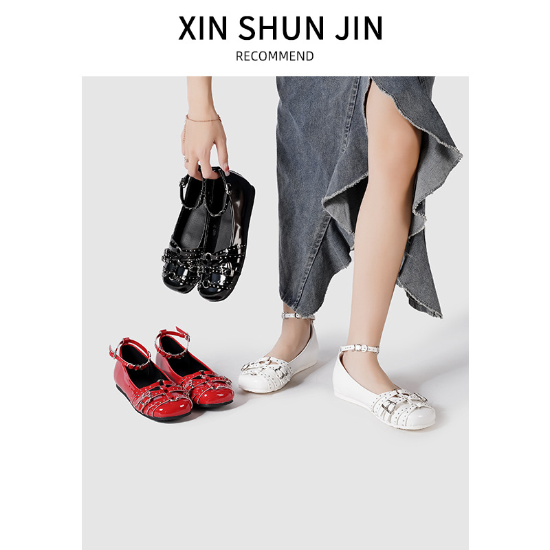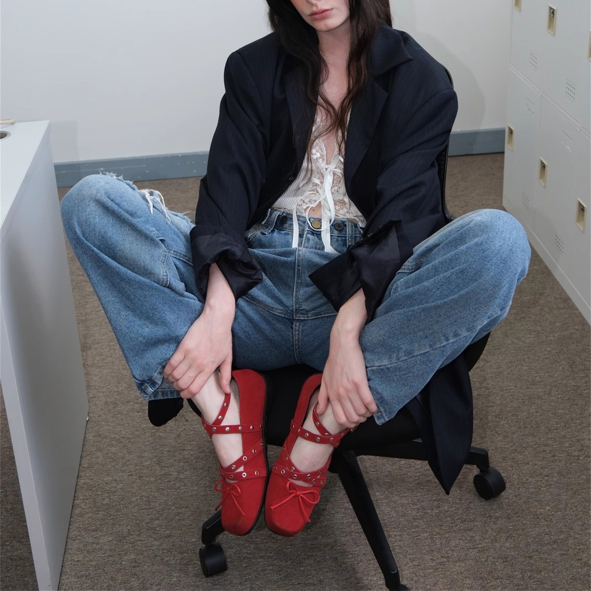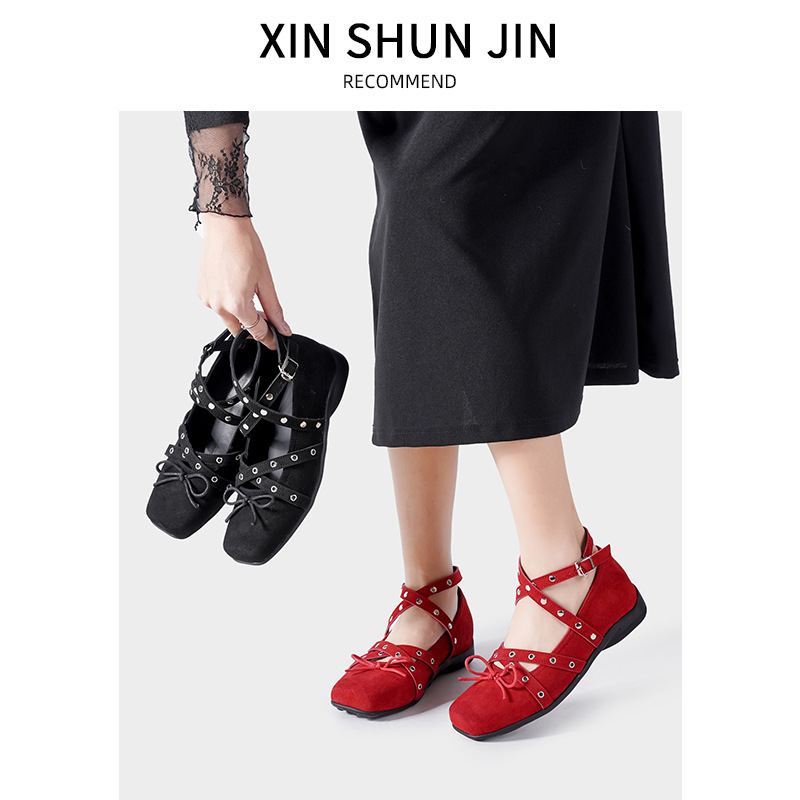 赤い蝶結びの靴の女性のフランス式の復古の小さい革靴2025春の新型のリベットのベルトはバレエのフラットシューズを締めます。