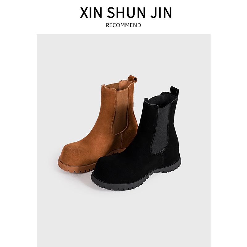 内は高くなって本革のタバコの筒の靴の女性の2024ヨーロッパ駅の小さい大衆の弾力性のチェルシーの靴の厚い底の復古の弾力性のショートブーツ