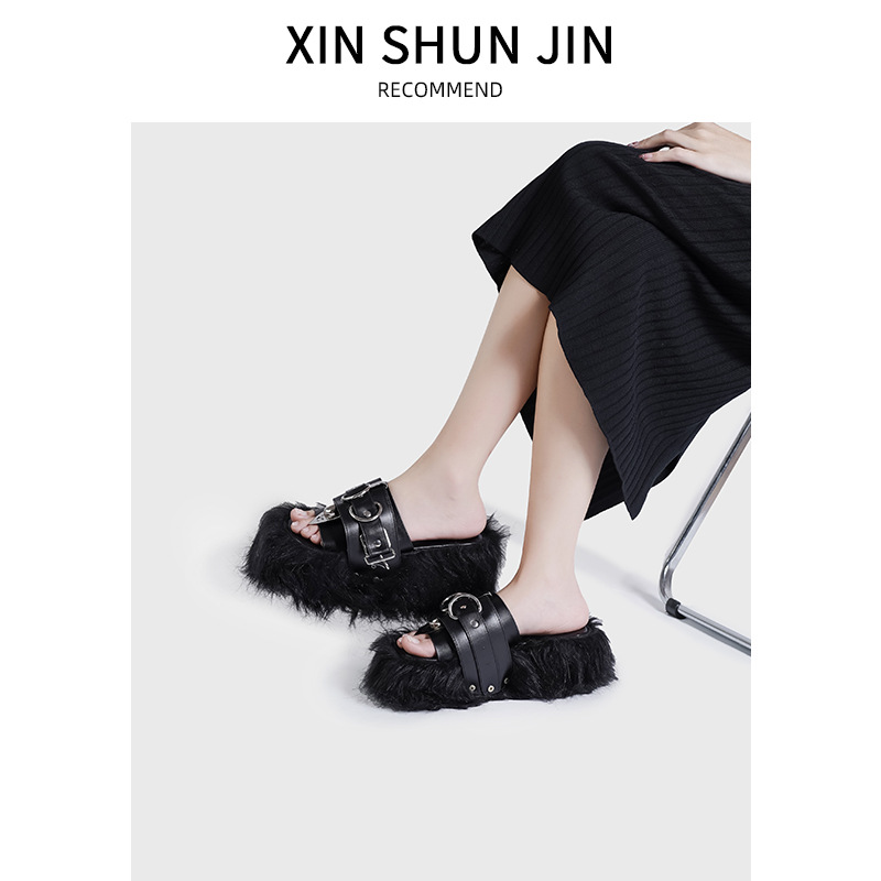 サンダルの外に女性2025夏欧米の金属パンク風亜文化毛毛がレトロな厚い底を引きずっている