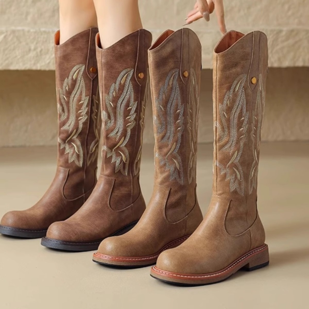 刺繍V口 ~ 西部カウボーイブーツ女2024秋冬新作バックファスナーローヒールロングブーツレトロ騎士靴