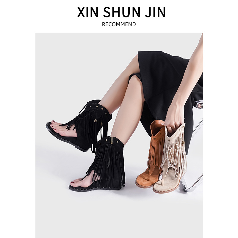 ローマリベットの足を挟んだフリンジサンダルの女性2024年の新型夏の足の指の側のファスナーの中で西部のサンダルを高くします。