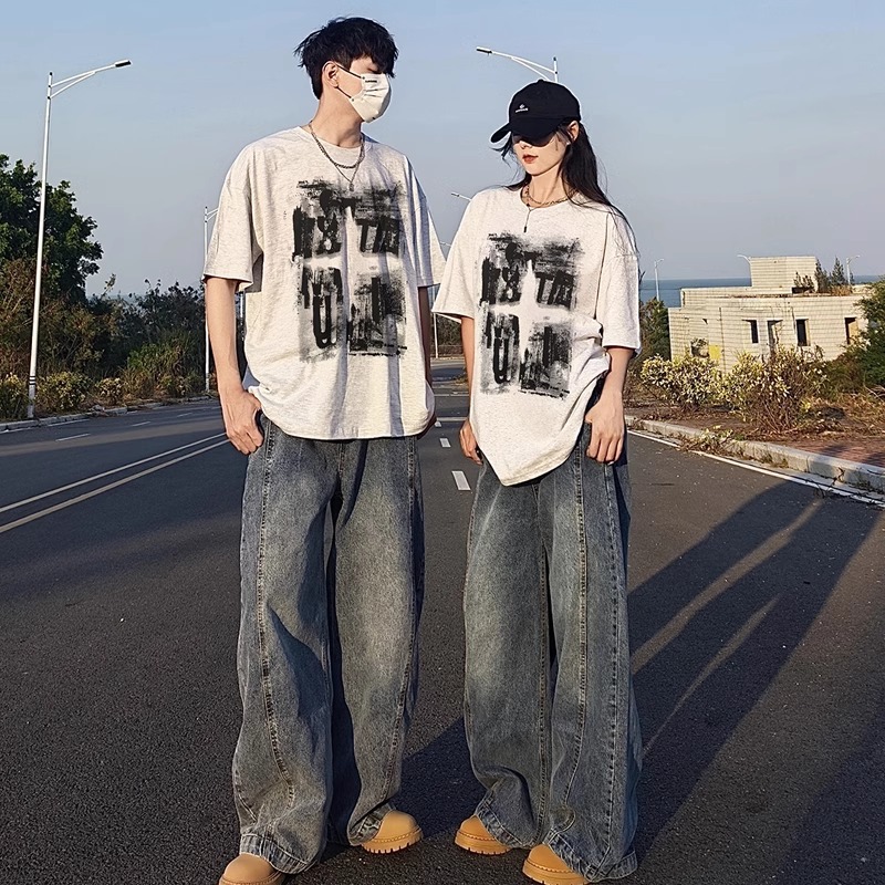 夏の純綿半袖Tシャツ、カップル着用、レイジースタイル、ルーズニッチデザイン、男女トップス、学生トレンドブランドクラスユニフォーム