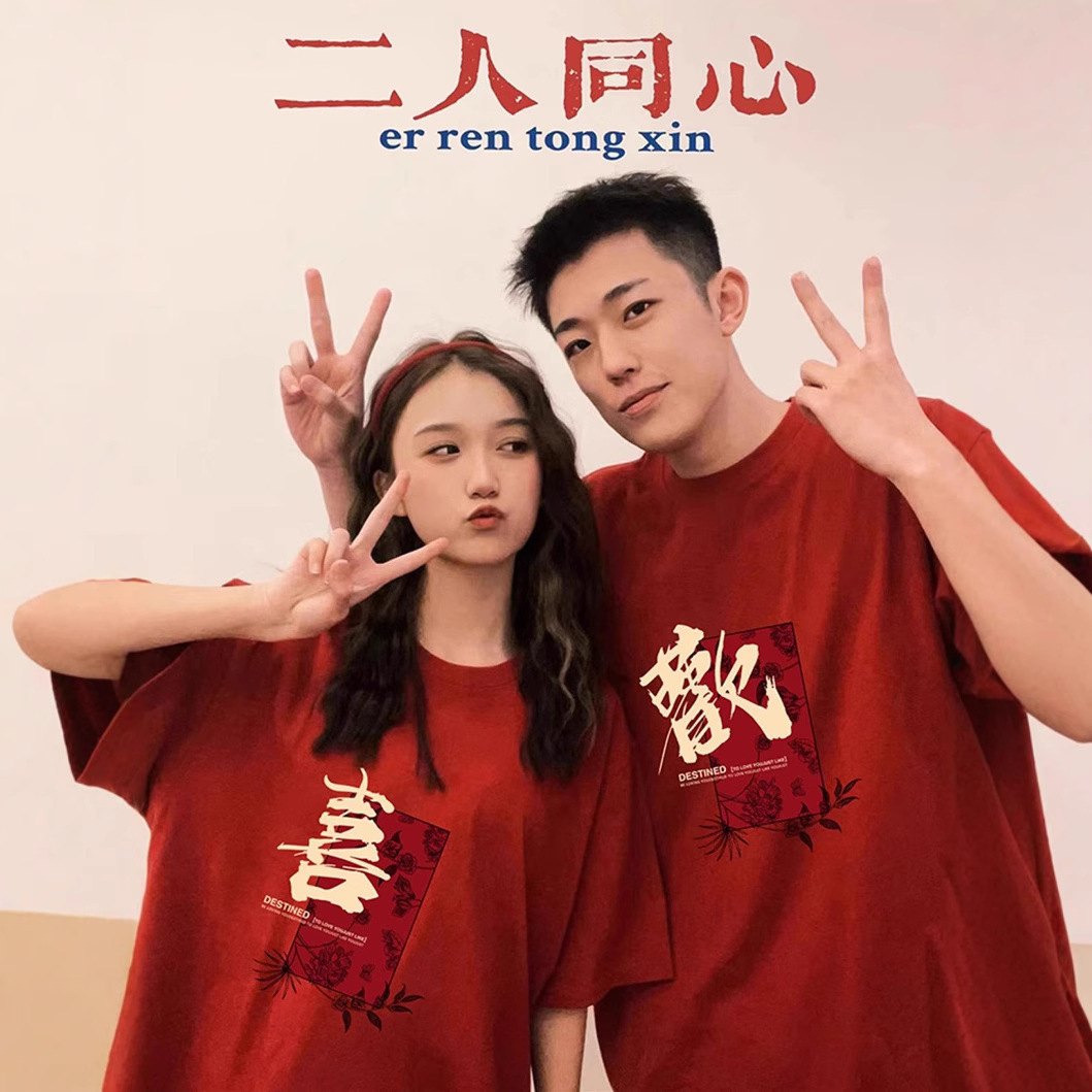 カップル服純綿半袖tシャツ2025新型本命年赤いお祝い結婚写真服ファッションクラス服