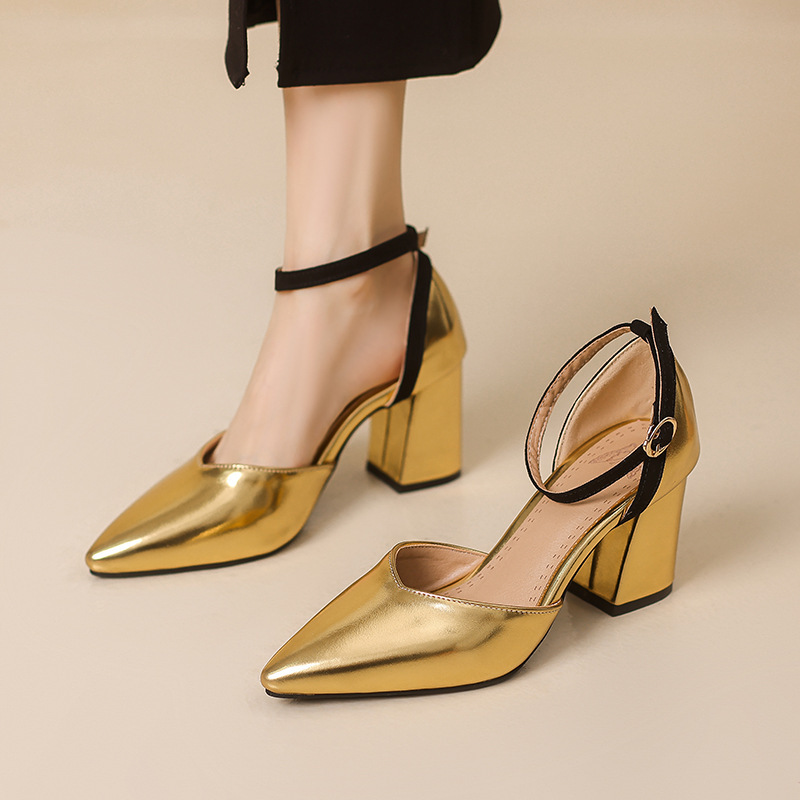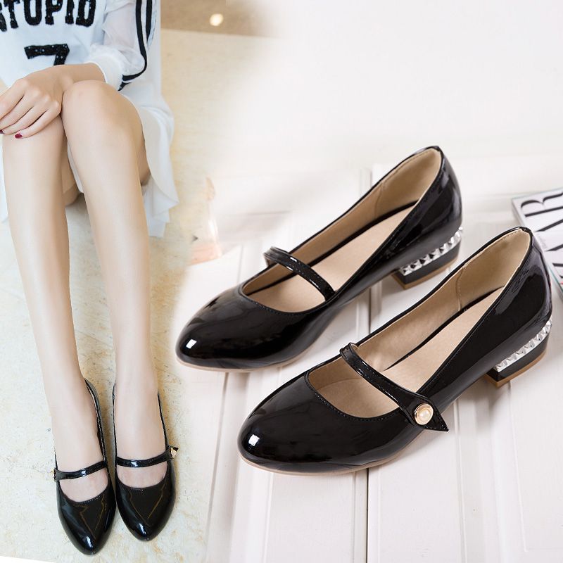 尖ったメアリージェーン靴復古英倫太と単靴春秋漆皮黒色婦人靴一字バックル付き女性靴