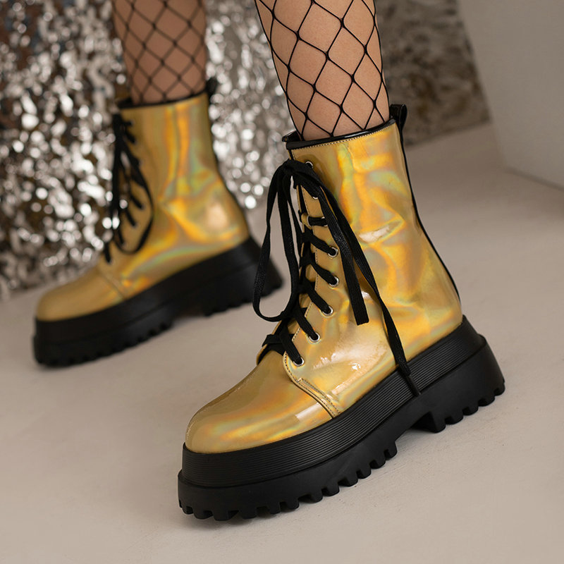 外国貿易の女性の靴のパンクの風の漆の皮の丸い頭の厚い底の太いかかとの中で前のひものショートブーツのファッションの女性のマーティンのショートブーツ