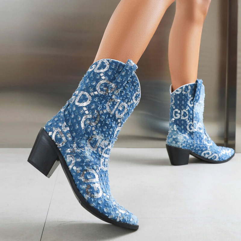 2025 外国貿易ウエスタンカウボーイブーツポインテッドトゥ太いヒールハイヒールカウボーイスパンコールスリーブハイヒールファッションブーツマーティンブーツ