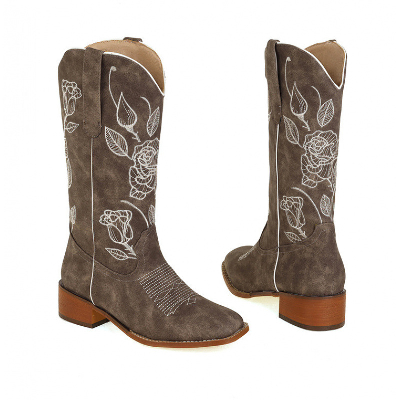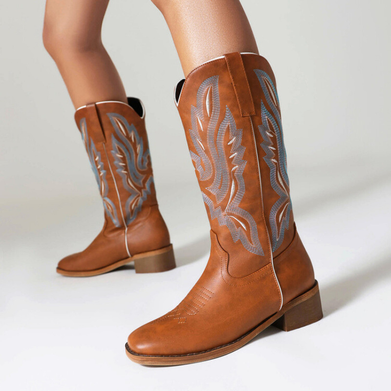 2025年新作クロスボーダー外国貿易厚底ウエスタンカウボーイブーツV口刺繍メンズブーツナイトブーツレトロミッドチューブスクエアトゥ