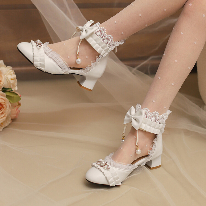 2025 新ロリータミッドヒールカレッジスタイルビッグ子供キャットウォークリボン中空サンダル大きいサイズ外国貿易クロスボーダー