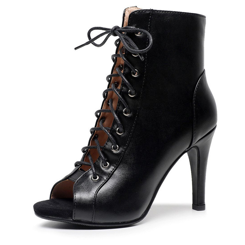 魚の口の冷たい靴の夏のPUの生地の女性のひもの細いと透かし彫りのショートブーツのジャズのダンスのハイヒールの露指のサンダルの女性
