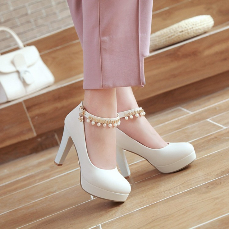 外国貿易の女性の靴の韓国版の新型の甘い真珠は太くて女性の靴の丸い頭の防水台の大きいサイズの女性の靴とボタンをかけます。