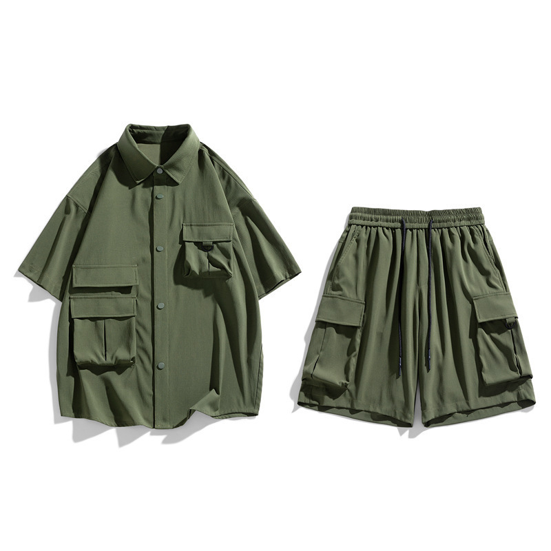 国潮レジャースーツ男性夏半袖ファッションブランド百合工装半ズボン運動二点セットカップル服卸売り