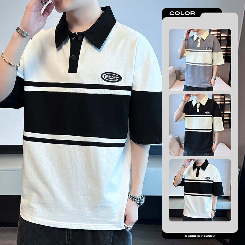 ストライプ半袖tシャツ男性夏新作ファッションPOLO折り襟ゆるい半袖日本系レトロ衝突色ボトムシャツ