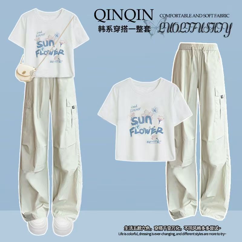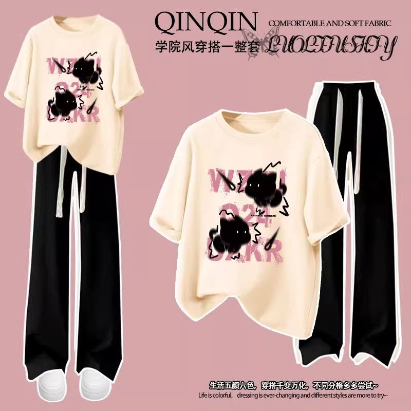 女子学生向け純綿Tシャツトップス、トレンドブランドゆったりラグラン、中・大型子供用半袖+ワイドジーンズ2点セット