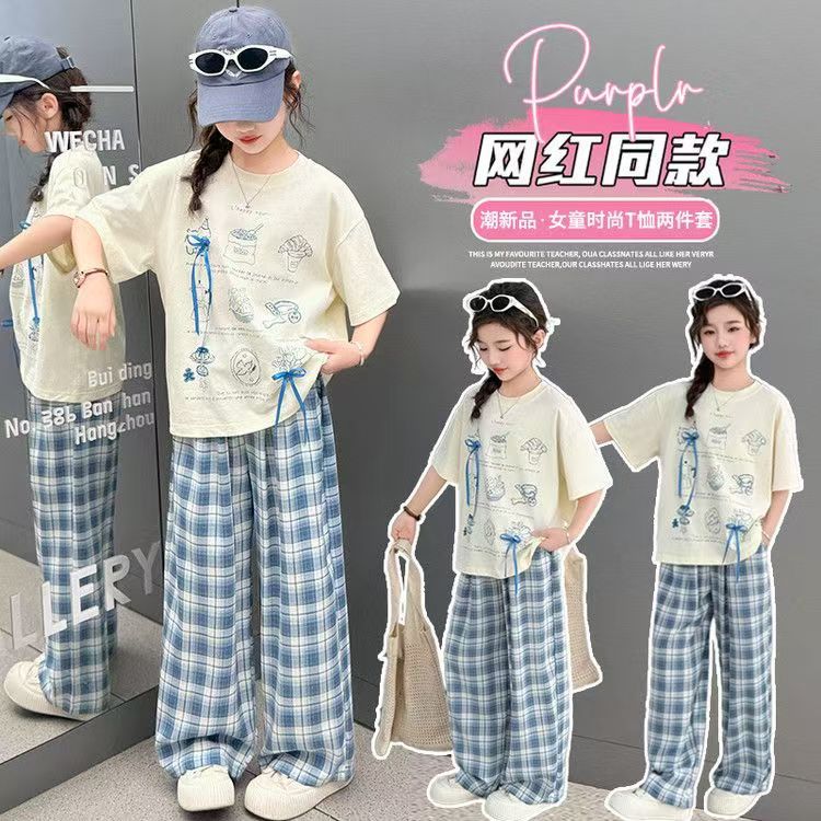 ガールズ 2025 夏スタイルルーズで多用途なリボン半袖チェック柄ワイドレッグパンツスーツプリントショート T パンツ