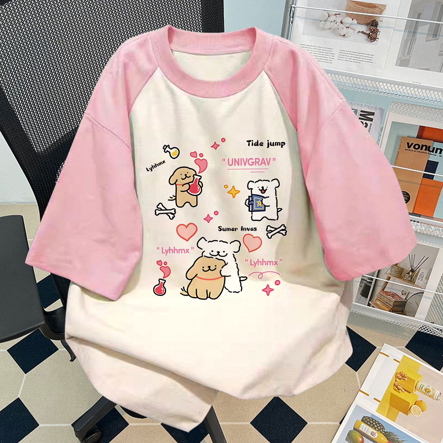 女の子半袖Tシャツ夏ルーズ2025新しい子供用コントラストカラーラグランスリーブスプライシングデザインシンプルトップトレンディ