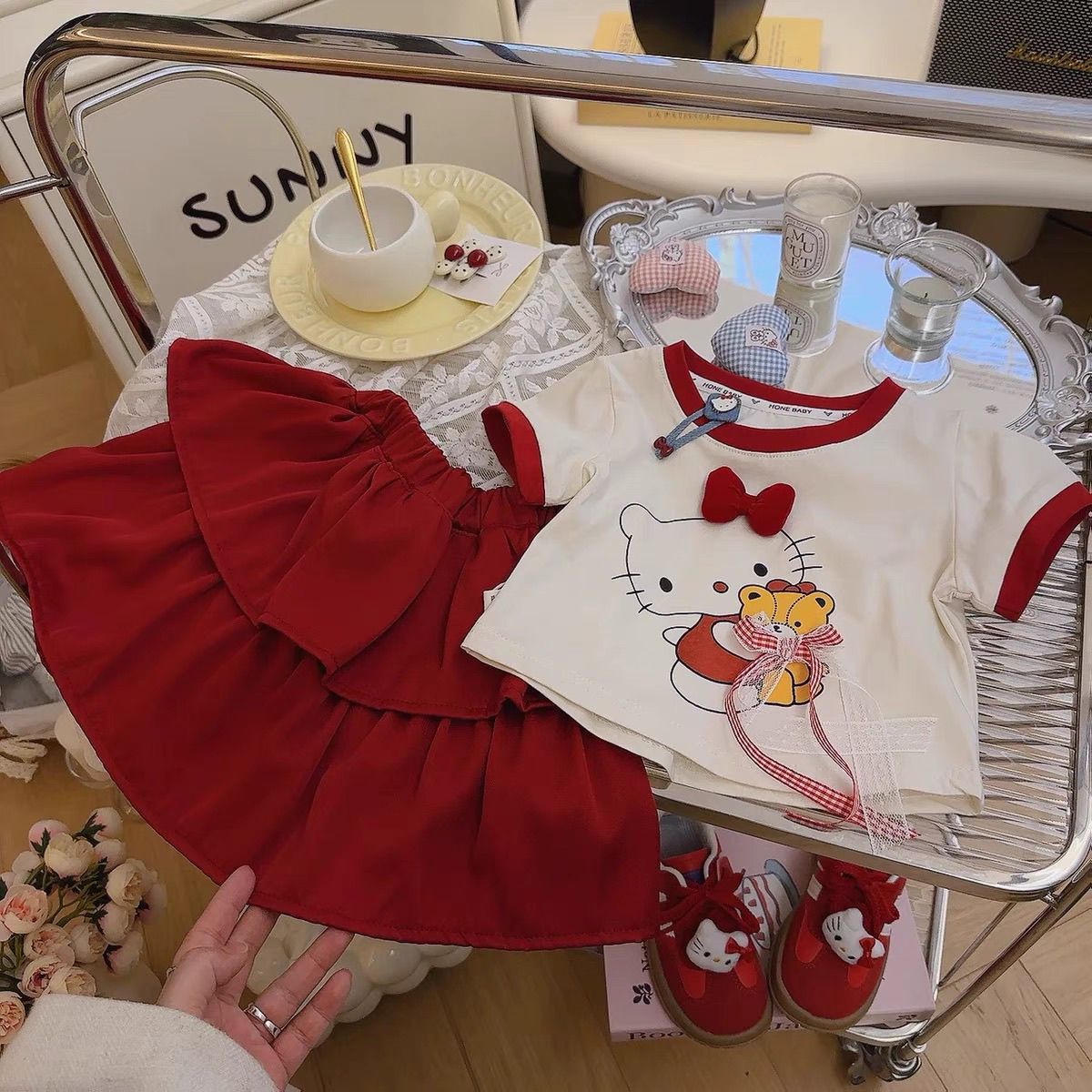 女の子サマースーツ 2025 新しいカレッジスタイルポロシャツ半袖子供ケーキスカートサマーカジュアル 2 点セット
