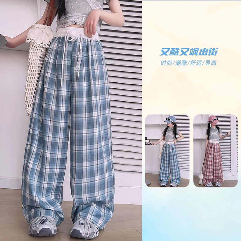 女の子チェック柄パンツ夏 2025 新しい韓国カジュアルストレートパンツ女の子と男の子のための子供のファッショナブルな薄いワイドレッグパンツ