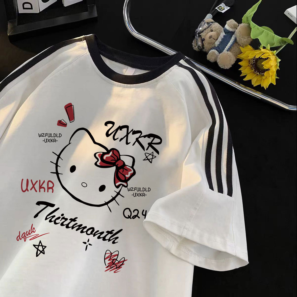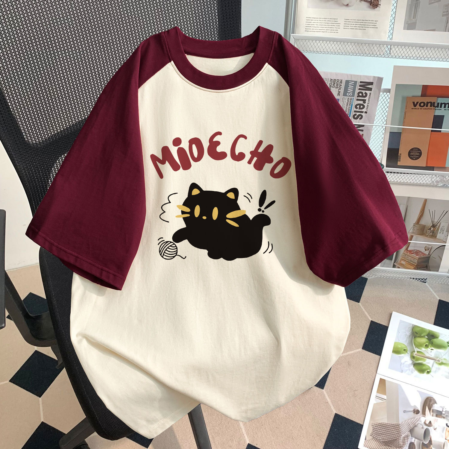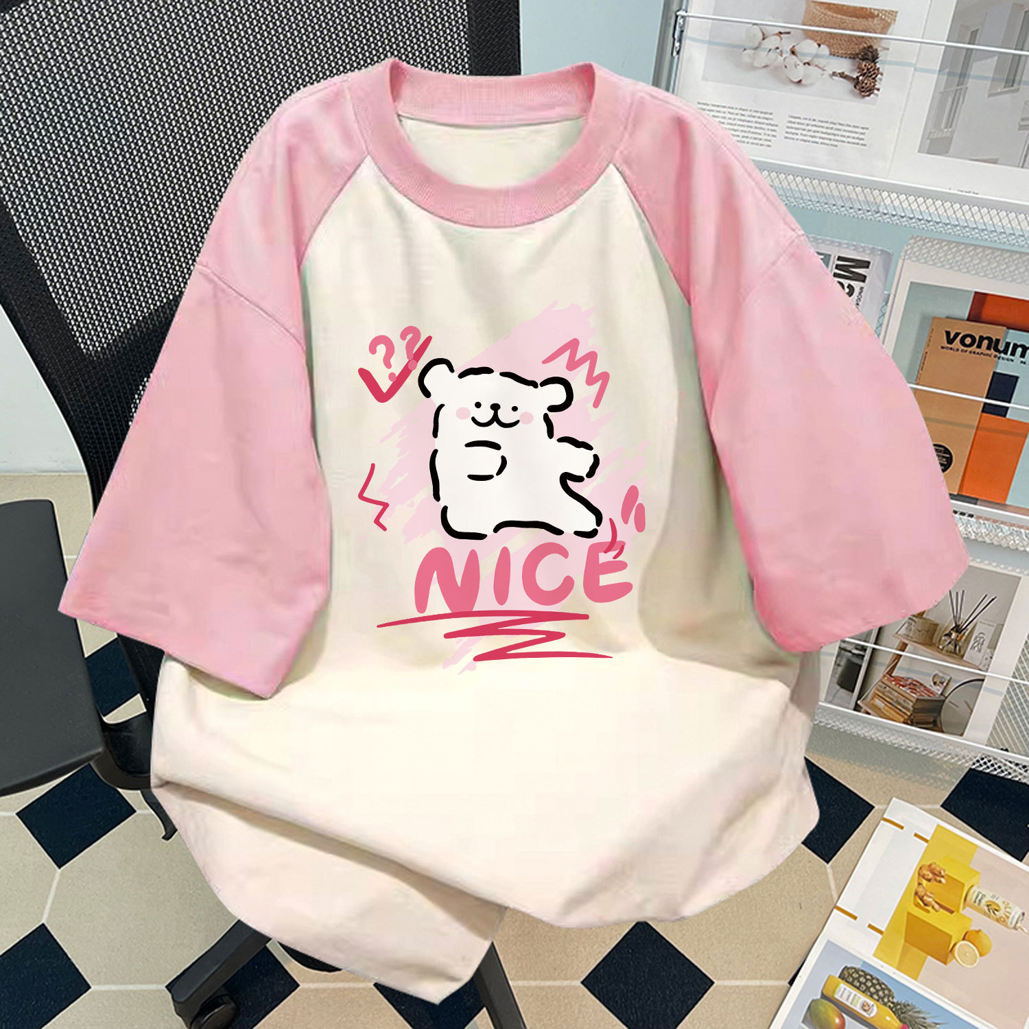 【純綿二重糸230g】女の子半袖Tシャツ夏ゆったり子供用コントラストカラーラグランスリーブ3本ポールデザインシンプル