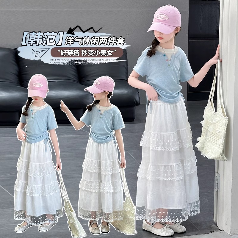 女の子スカートサマードレス 2025 新しい子供のケーキプリンセススカート子供女の子レース白ロングスカート