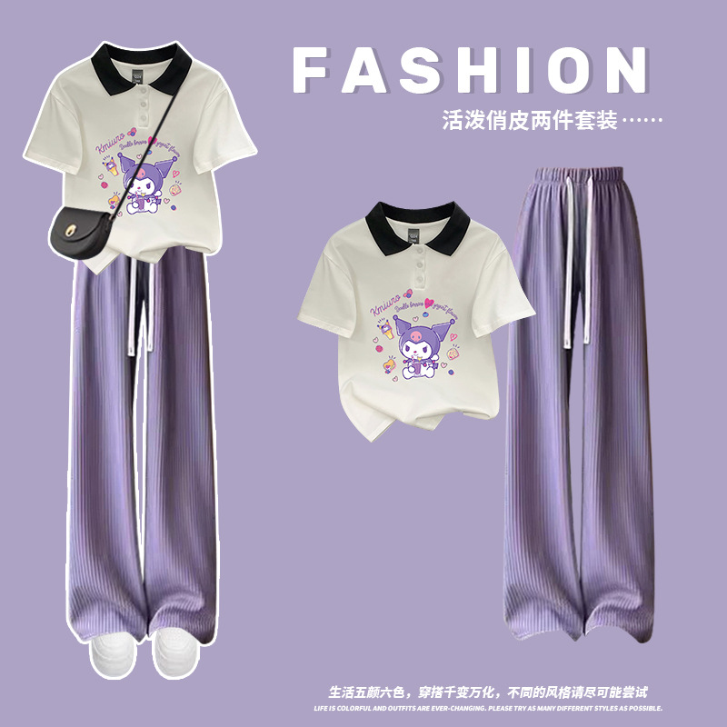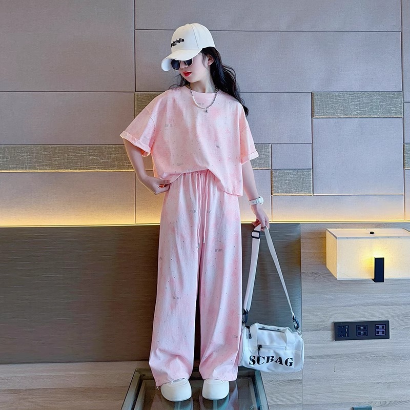 8002-0009-147 女の子カレッジスタイル半袖Tシャツ女の子夏ファッションカジュアルワイドレッグパンツ2点セット