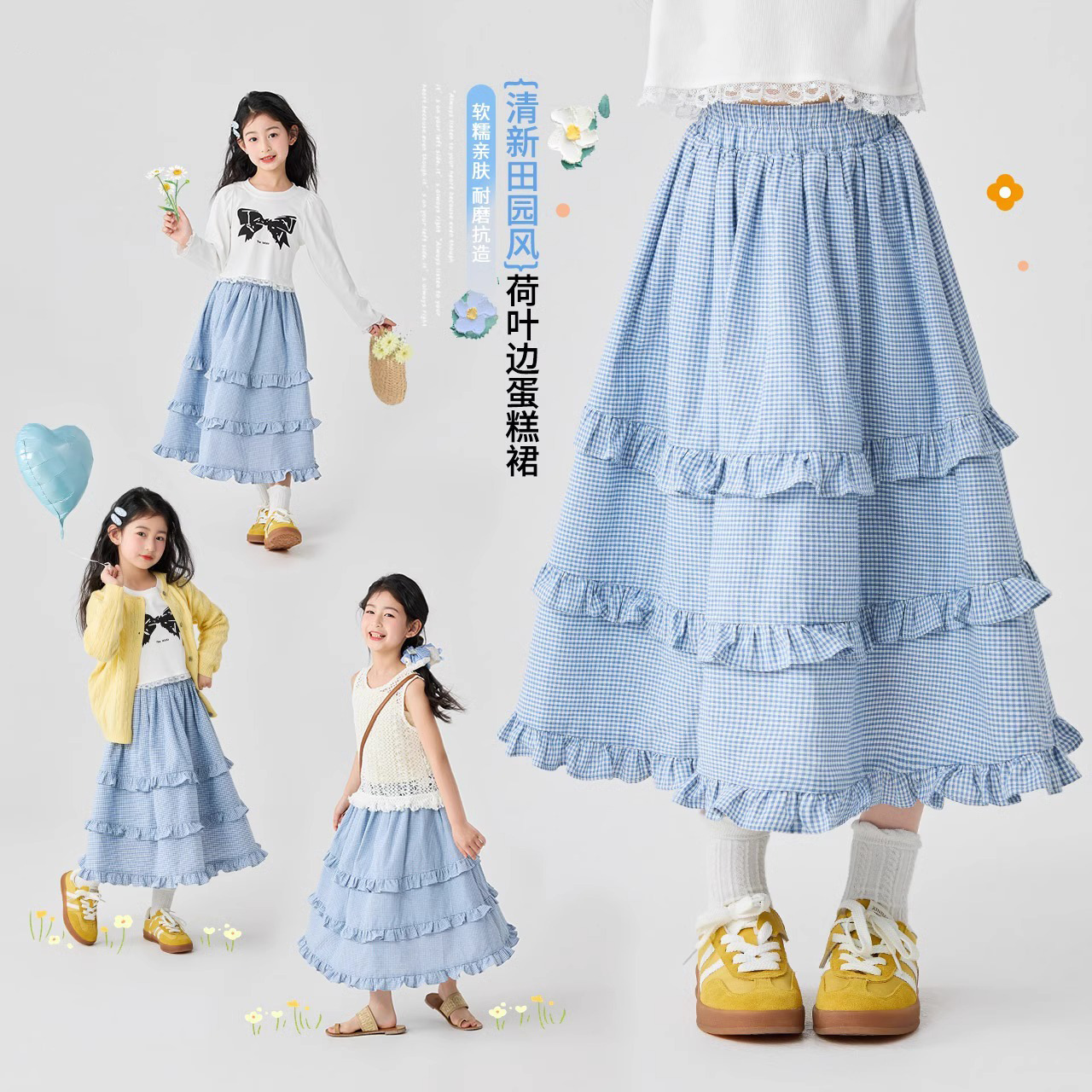 女の子の半身のスカートの春秋のタイプの子供の洋気のハスの葉の辺のスカートの子供の大きい子供の格子縞の中で長いタイプのケーキのスカートの女の子