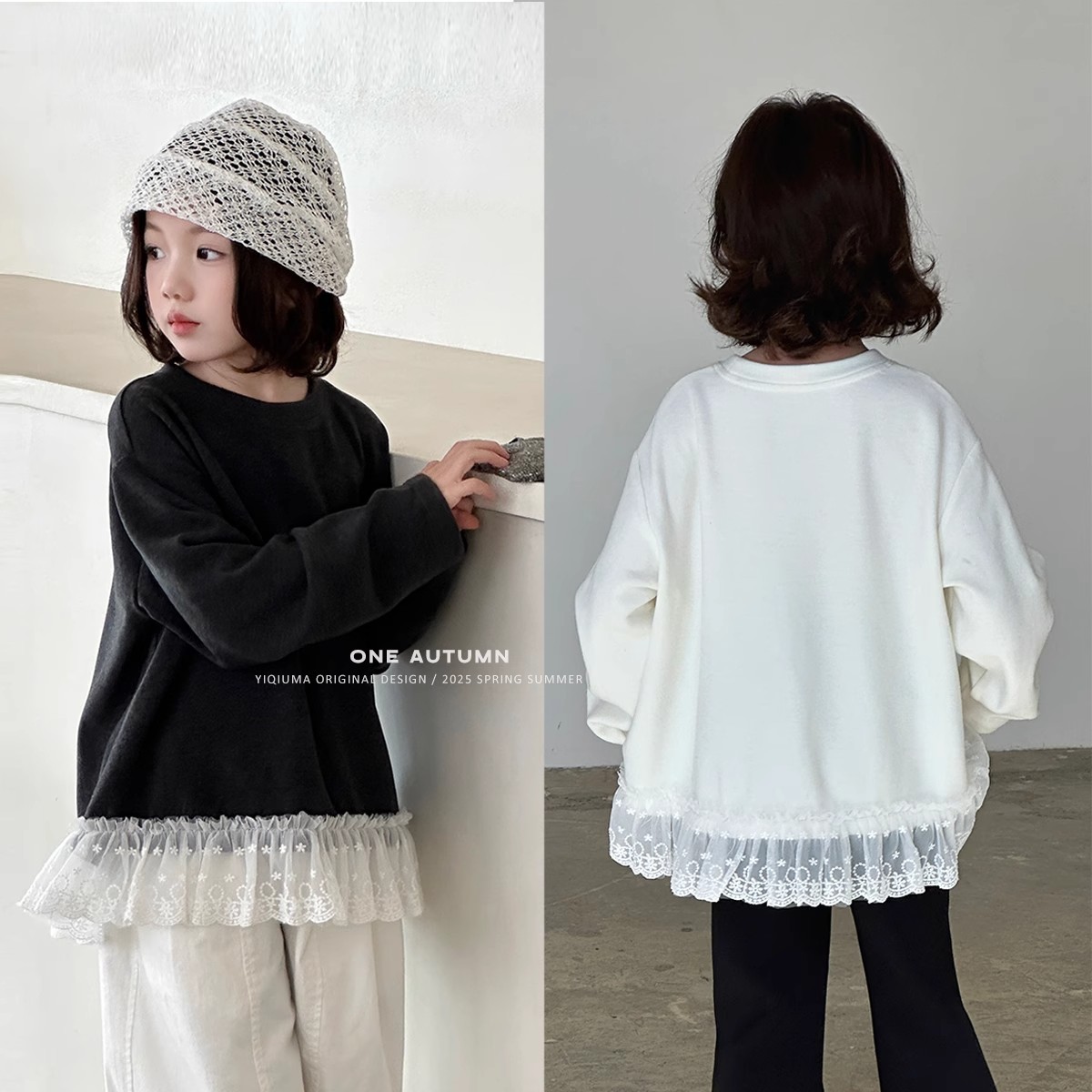 1546 # 2025 春の新スタイル女の子レース Tシャツ中大子供ルーズファッションボトリングシャツトップ子供服