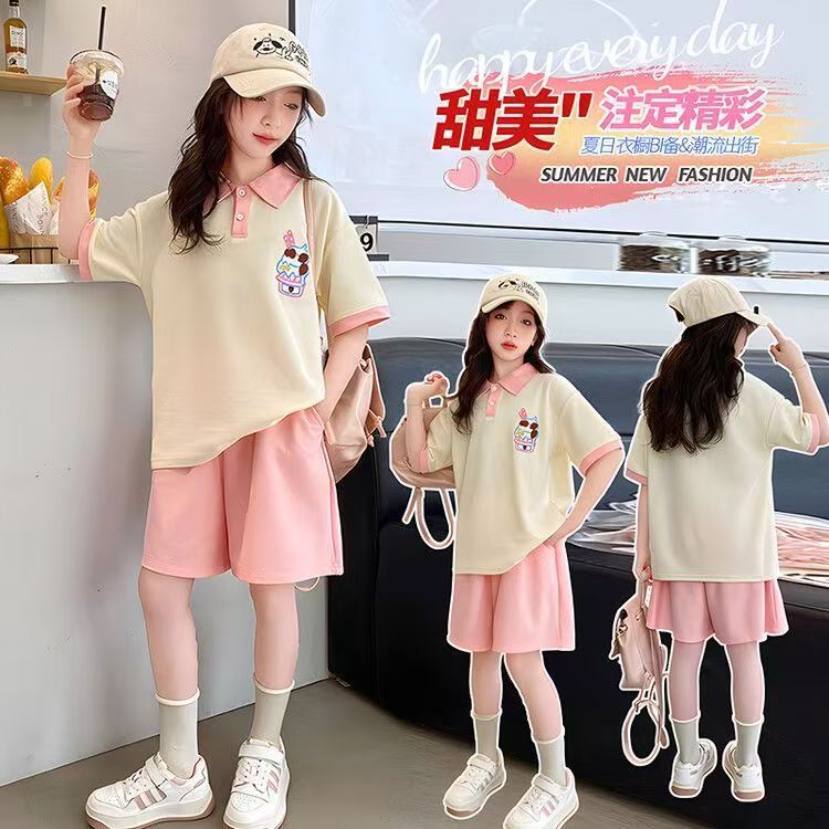 女の子サマースーツ 2025 新しい子供スタイル薄手カジュアル半袖サマースーツ大きな子供のサマーショーツ 2 点セット