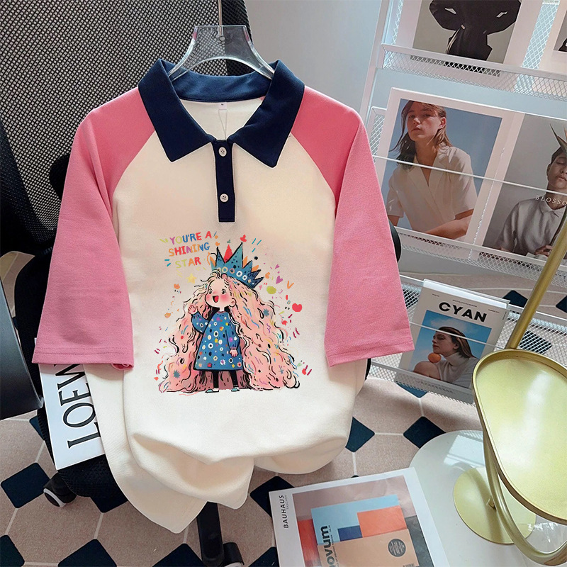 0012-504 中大型子供半袖Tシャツ女の子ルーズコットン2025夏新作ラグランコントラストカラーボトリングシャツ