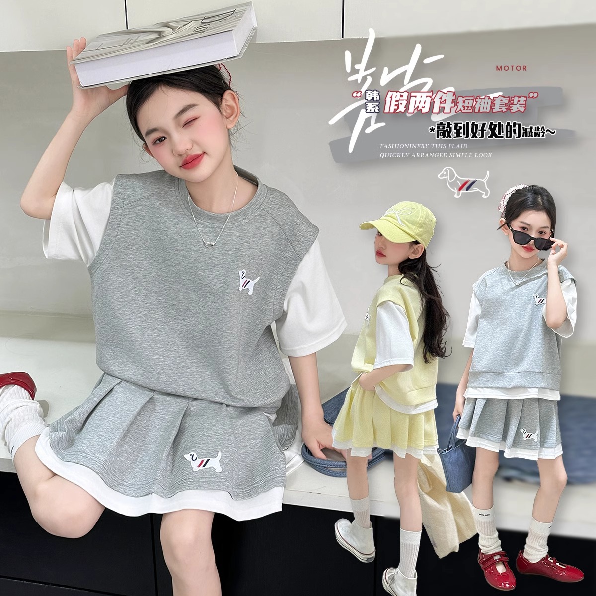 女の子ドレスサマードレス 2025 新しいスタイル子供のカレッジスタイルスプライシング半袖スーツ女の子サマースカート