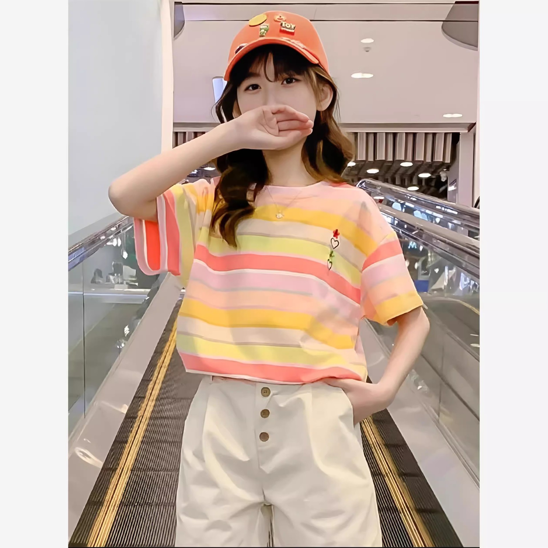 1543 女の子半袖 Tシャツ夏 2025 新しい子供服大きな子供小さな女の子半袖服ストライプ Tシャツ