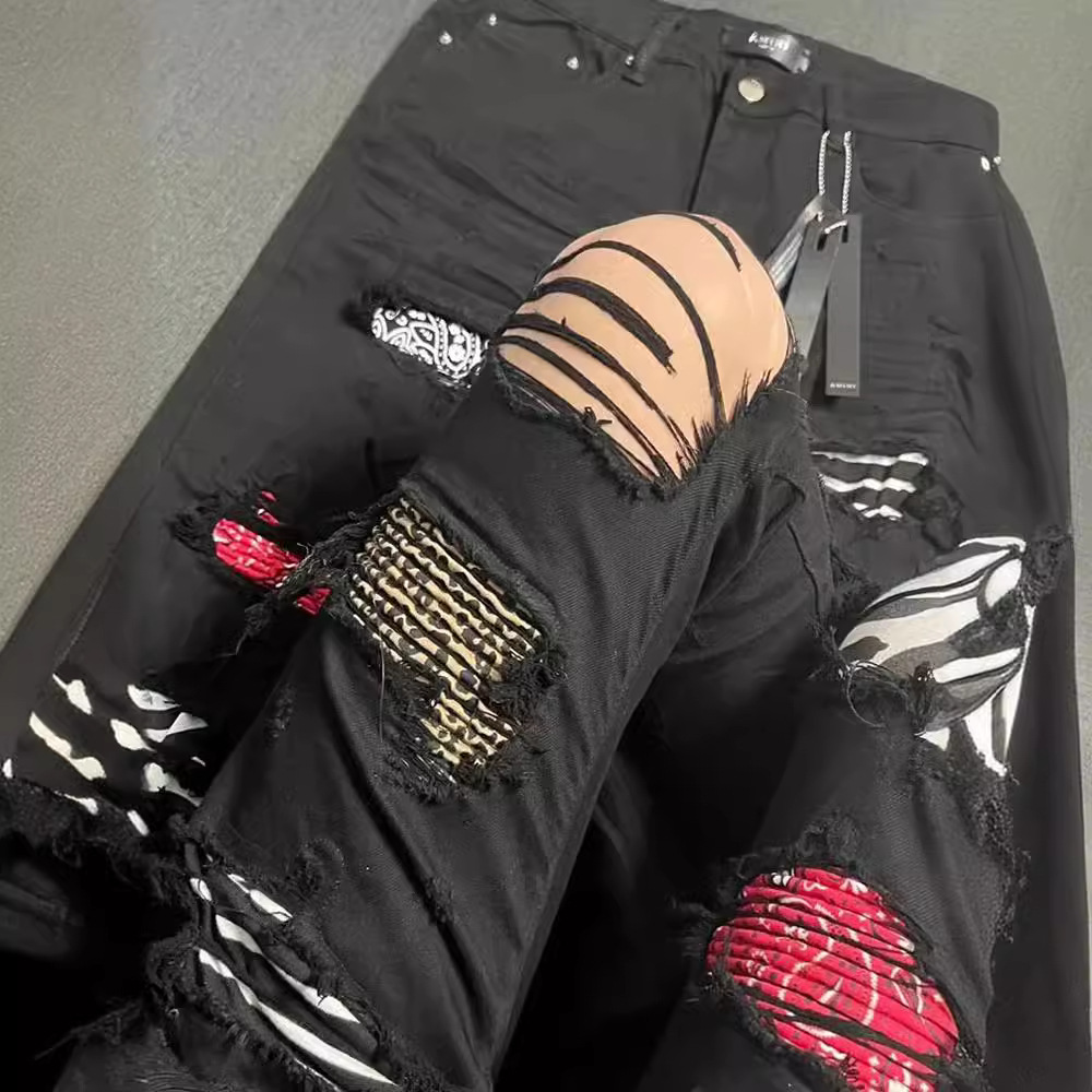 自主高街アメリカ豹紋は穴を割ったパッチジーンズ男amネット赤同金fog修身小脚ズボンをつなぎ合わせた