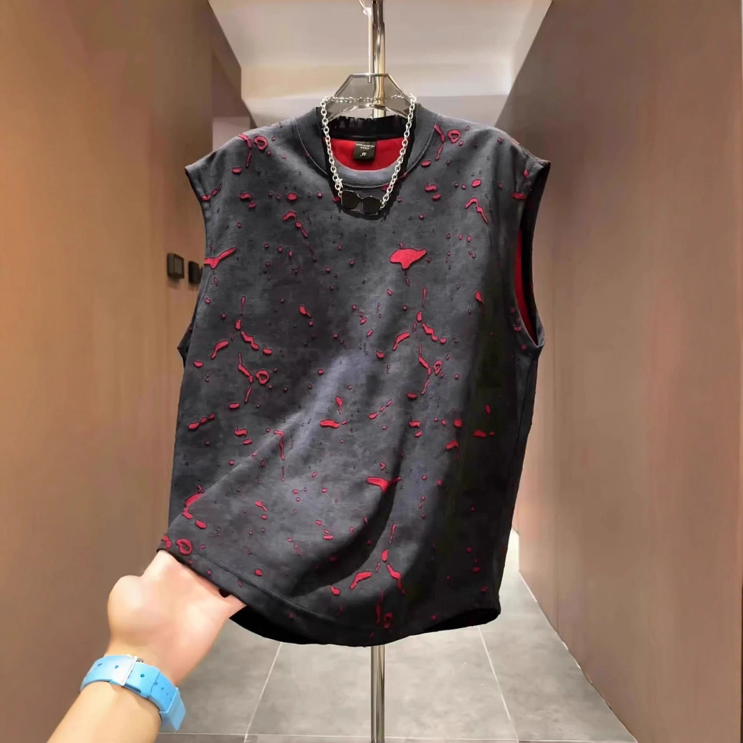 夏の新しいスタイルのバーニングフラワーリッピングデザインラウンドネックノースリーブベストメンズトレンディでファッショナブルな多用途スポーツベストTシャツ
