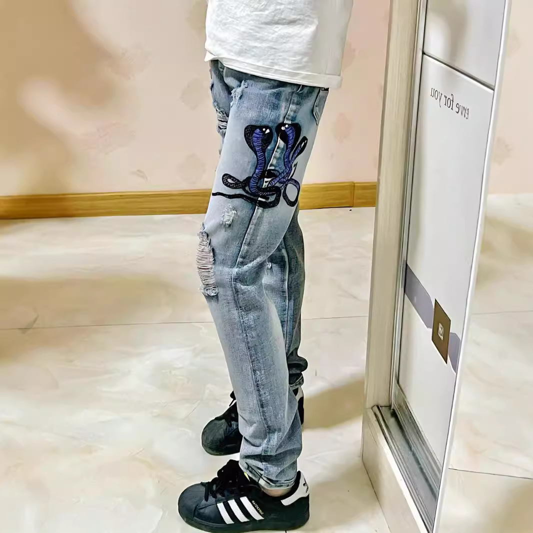 男性の夏のファッションブランドのアメリカの高い街のコブラの刺繍の穴のジーパンのファッションのカジュアルなネットの赤いタイプの小さい足のズボン