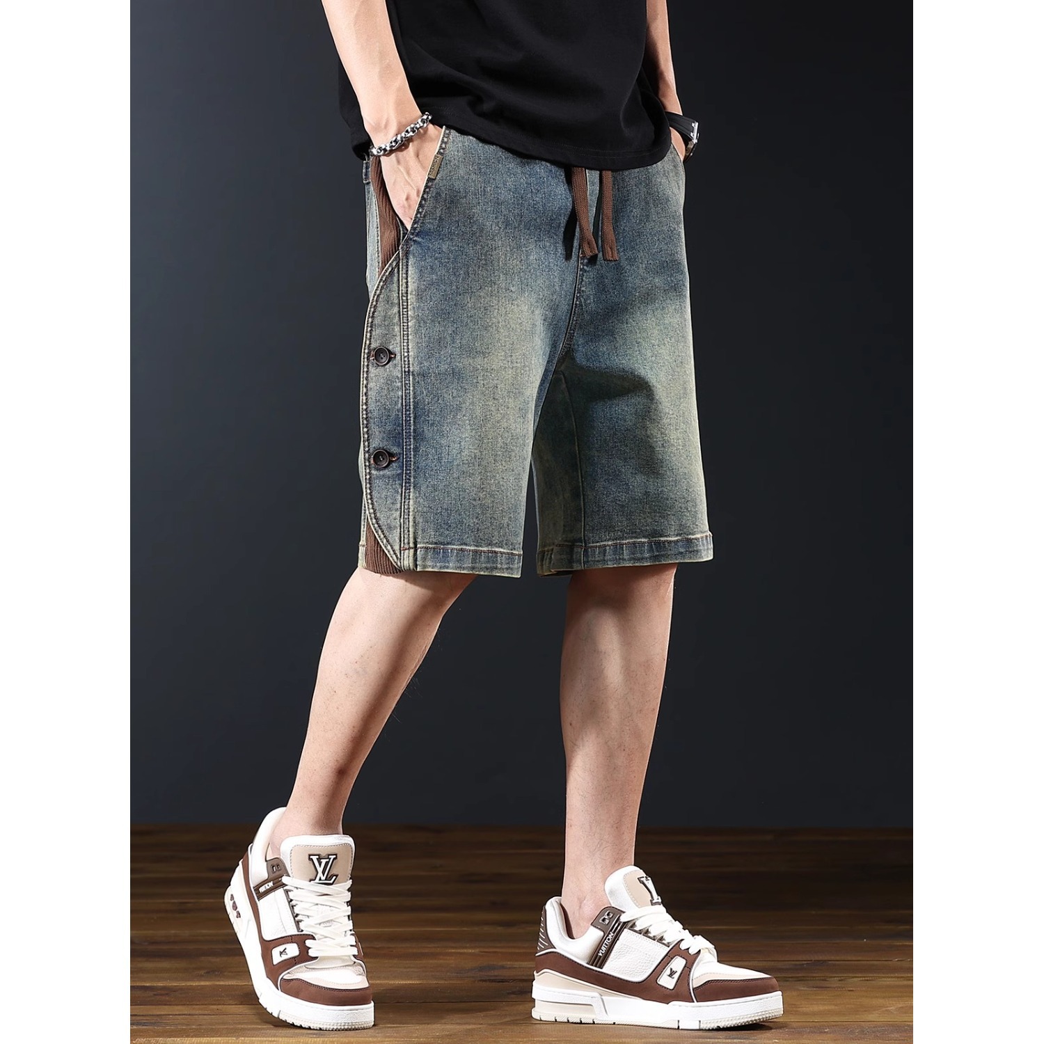 アメリカンヘビーウェイトデニムショートパンツメンズ2025年夏新作ルーズ5点パンツウエストゴム大きいサイズトレンドブランドミッドパンツ