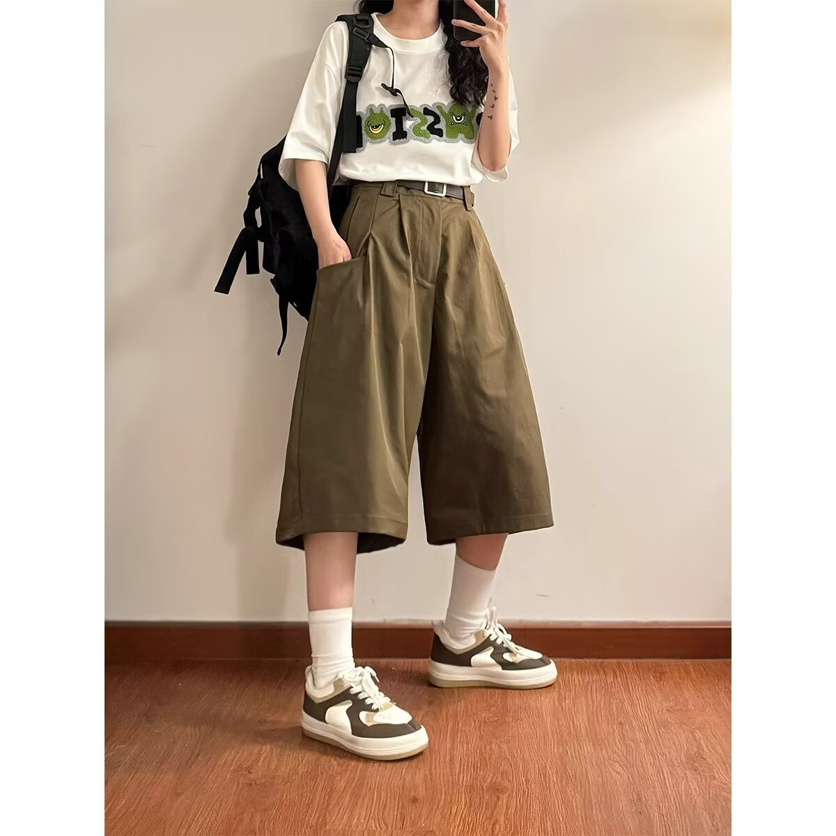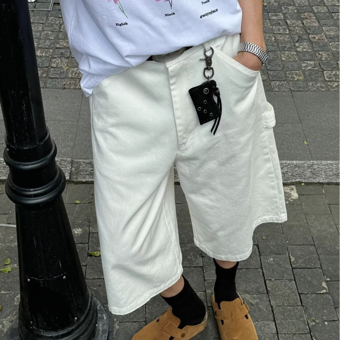 日本製白デニムショートパンツメンズトレンディ韓国風無地カジュアルクロップドパンツストレートレッグルーズ万能ワイドレッグミッドパンツ