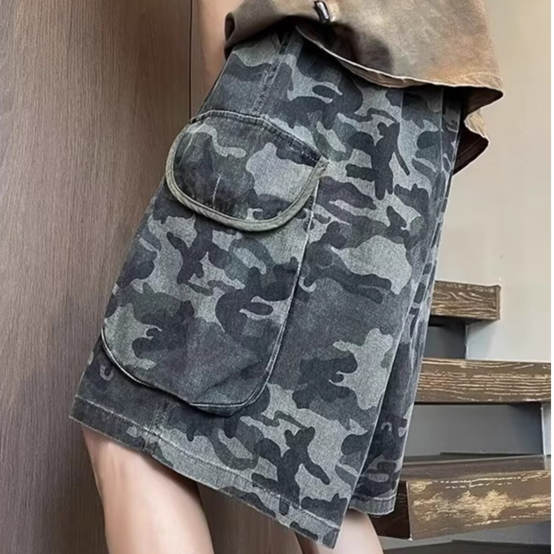 ハイストリート迷彩ワークウェアデニムショートパンツメンズ2025夏ウォッシュデザインストレートワイドレッグ5分丈パンツ