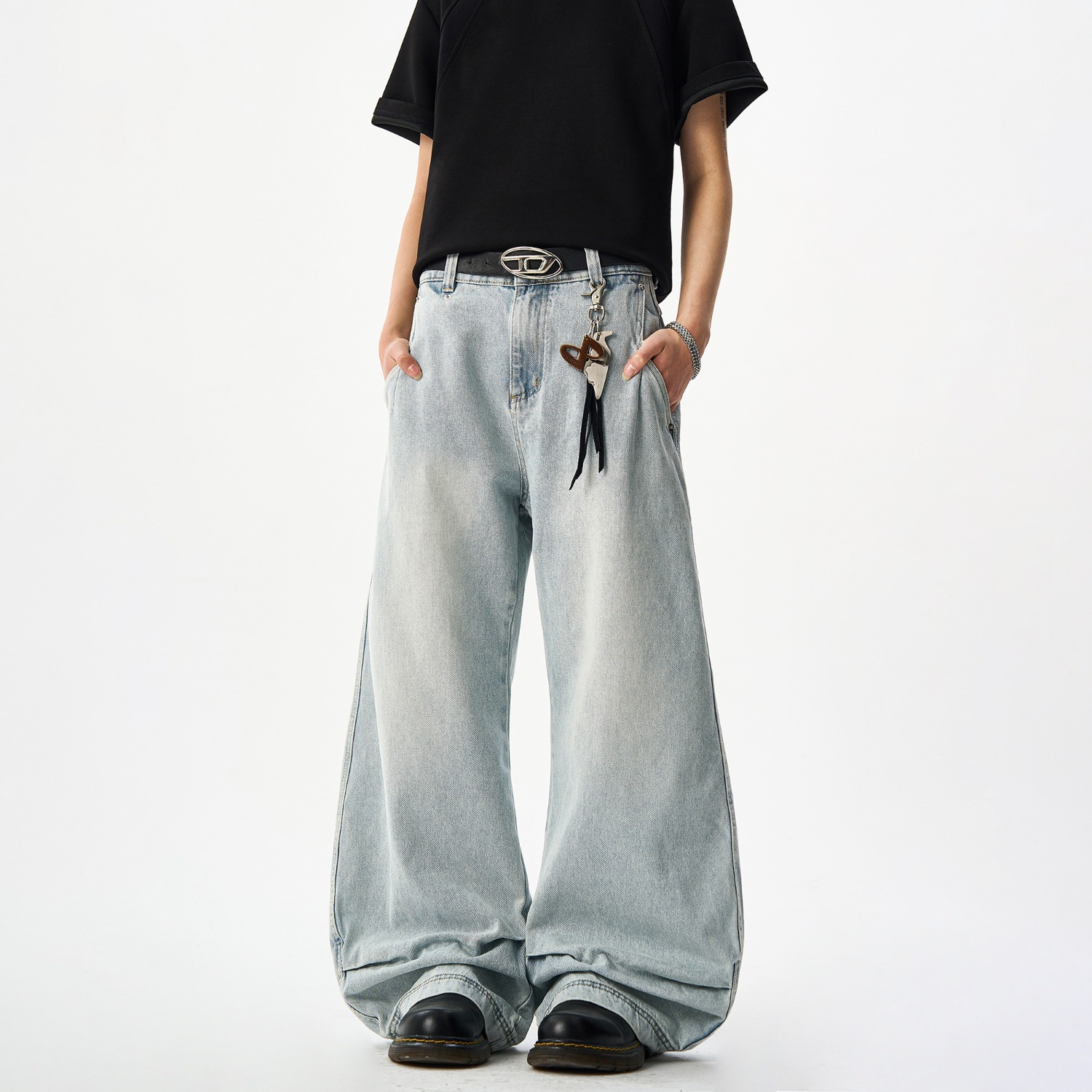 アメリカンレトロなウォッシュ加工のダメージ加工デザインのスモールセーバージーンズ、ハンサムでハイエンド、ファッショナブルでドレープ感のあるワイドレッグ鎌パンツ