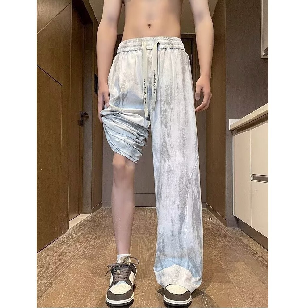 アメリカンスポーツワイドレッグロングパンツメンズ夏薄い2025新しいストレートホワイトグレーファッションワイドレッグカジュアル