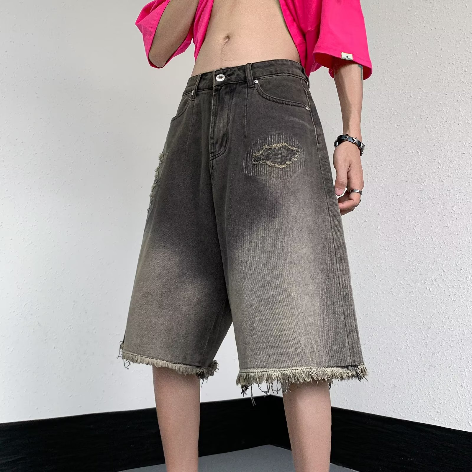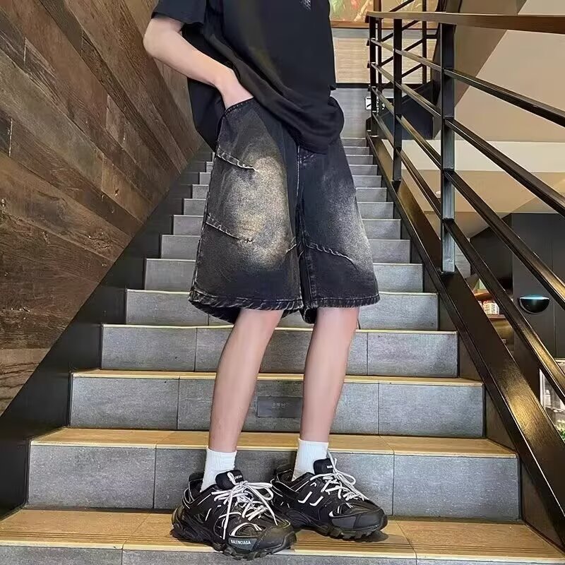 アメリカンレトロウォッシュストレートデニムショートパンツメンズ2025年夏新作ダメージ加工ルーズアメリカン5点パンツ