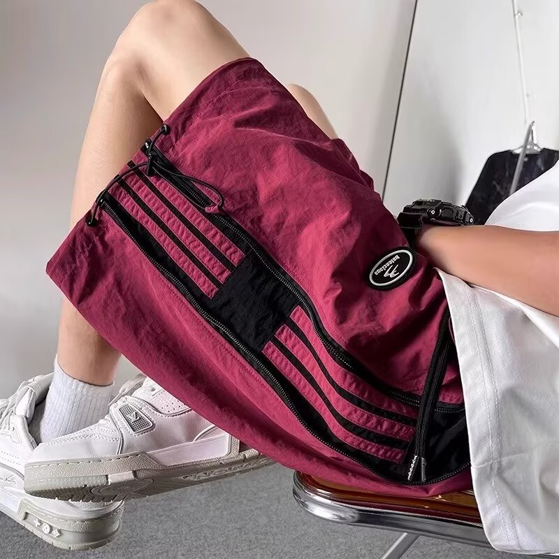 ストライプスポーツショーツメンズ2025夏薄手速乾ジッパーワークパンツデザインカジュアルアイスシルク5点パンツ