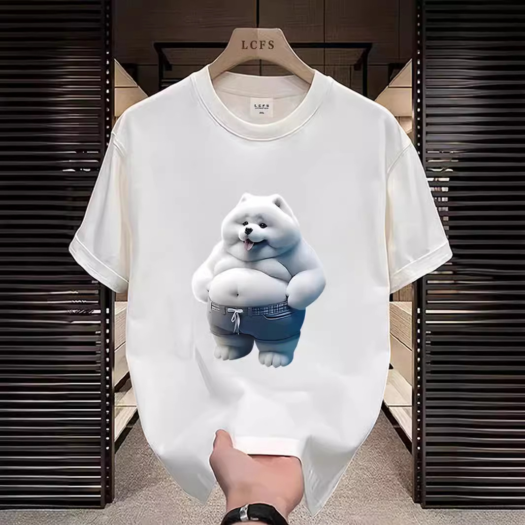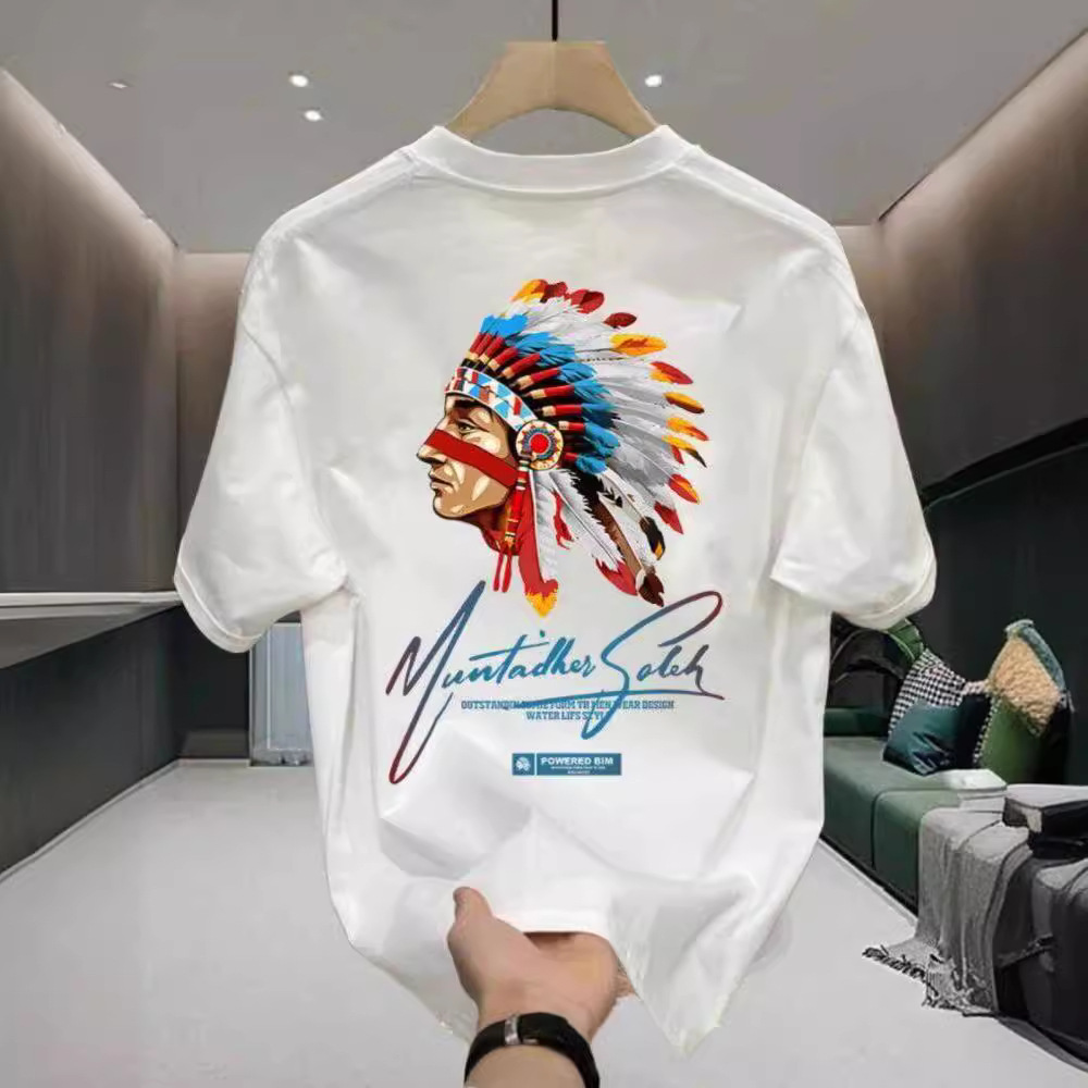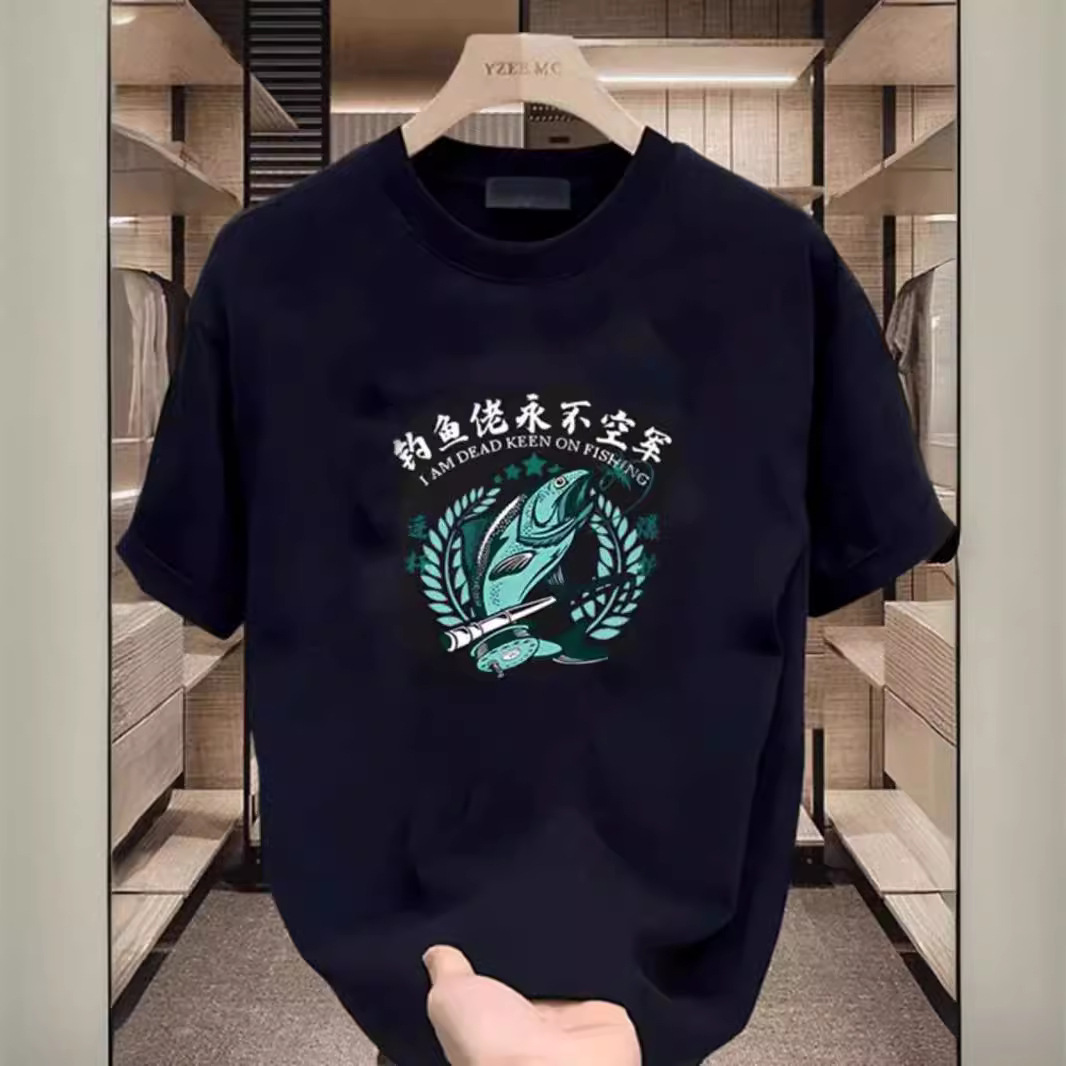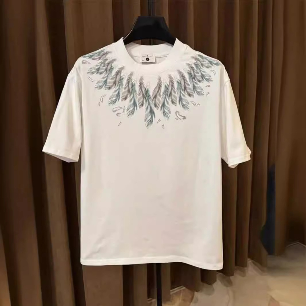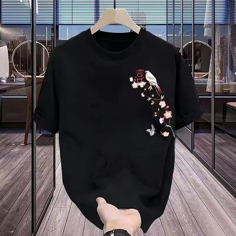 2024夏百合半袖欧米トレンド新型羽羽プリント男性ファッション丸襟ゆるいtシャツ