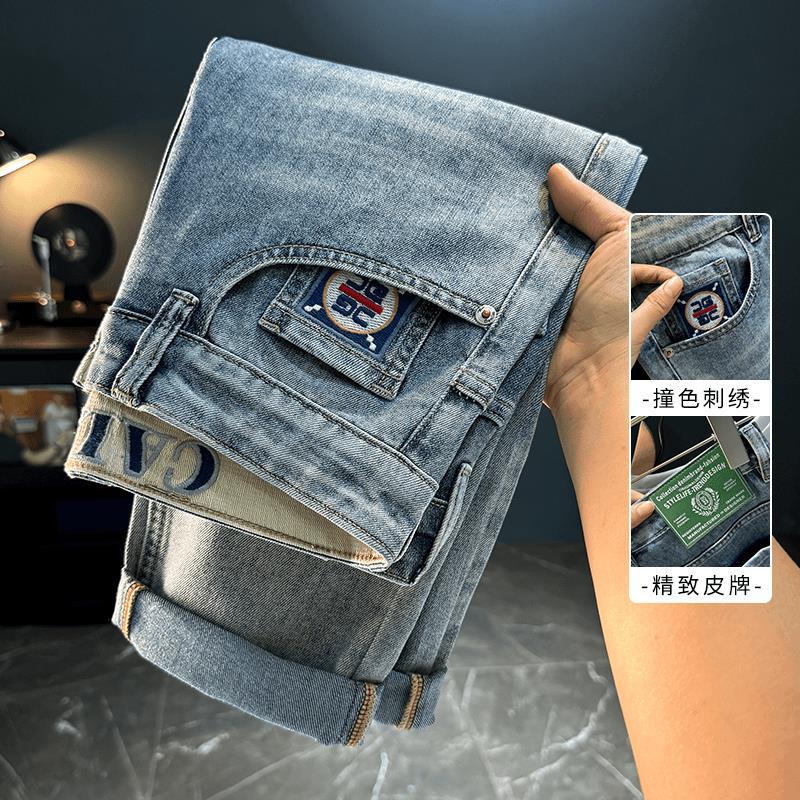 夏の薄っぺらな流行のジーパンの男性のファッションのまっすぐな筒の薄い藍の修身の百合の刺繍の男性のデニムのズボン